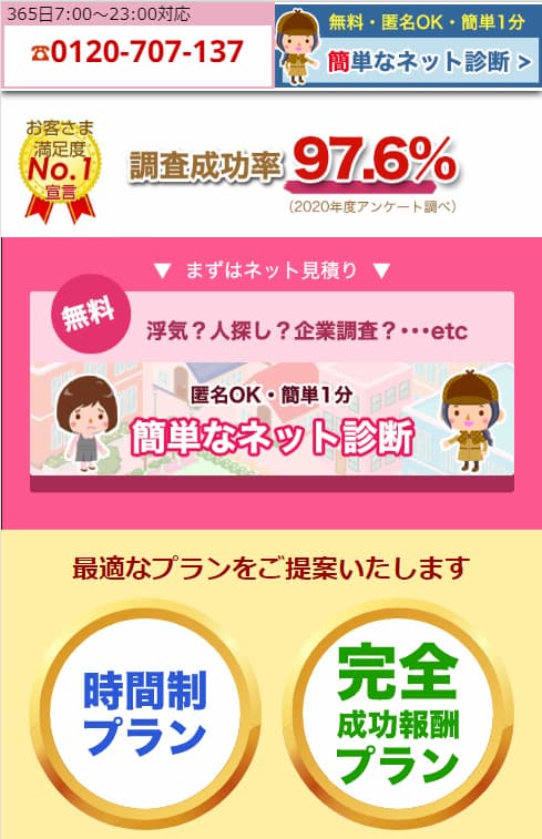 料金は時間制プランの場合、調査員1名1時間あたり7,000円のみとなります。広告費などを極限まで削減することで圧倒的な低価格を実現しています。相場は10,000円〜15,000円ですので、非常に安い費用で調査できます。