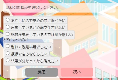 HAL探偵社の公式サイトからの匿名無料相談は5つの質問について回答するだけです。ぱぱっと入力してしまえば回答には1分もかからず、拍子抜けするほど簡単でした。