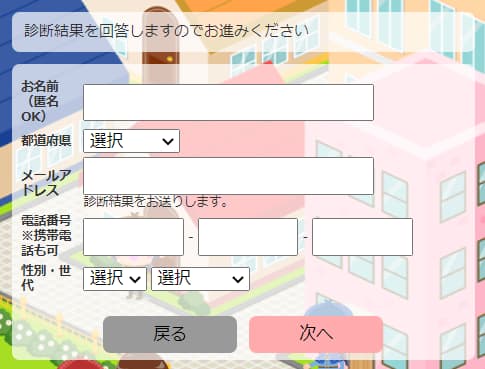 名前は匿名やニックネームでもOKです。電話番号やメールアドレスの入力が必要となりますが、「迷惑メールやしつこい勧誘はございませんのでご安心下さいませ。プライバシー厳守。」という記載があり、実際に私が試した時も勧誘や営業は一切ありませんでした。